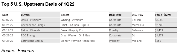 “All the factors that kept upstream deals resilient in 2021 carried over into the new year,” said Andrew Dittmar, director at Enverus. “That included a need for inventory by public companies, ready private sellers and favorable pricing. However, the volatility in energy prices caused by Russia’s invasion of Ukraine stalled nearly all deals in March.”